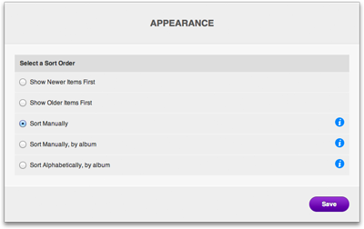 Sort manually, by album (Audio only) - Audio content is organized into album Manually drag/drop content into the desired