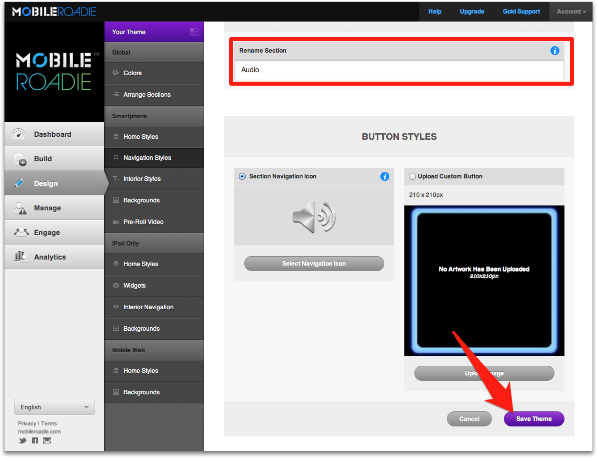 3. Rename the section and click 'Save Theme'