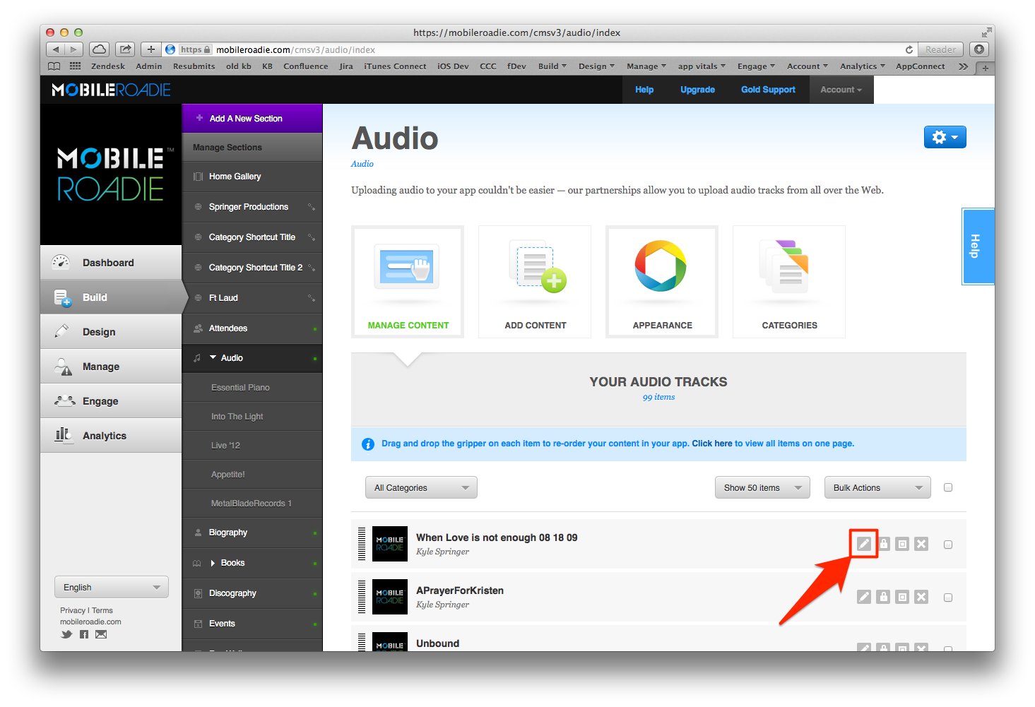 The Edit button can be found throughout the CMS in the Build Menu, Design Menu, and Engage Menu. This button allows content text, images, and other options to be viewed and changed.
