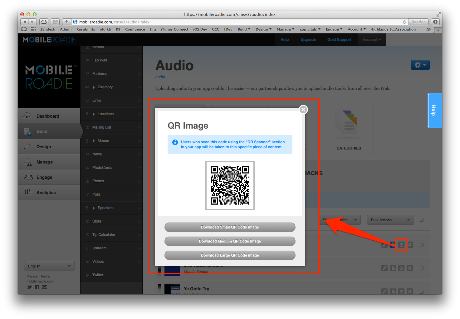 Content QR Code can be found in the Build Menu under the Audio, Photos, and Videos sections as well as in the Engage Menu. These QR codes can be used in Push Notifications, Popup Promos, emails, marketing posters, t-shirts, other locations in the app, and countless other locations to redirect users to the associated content.