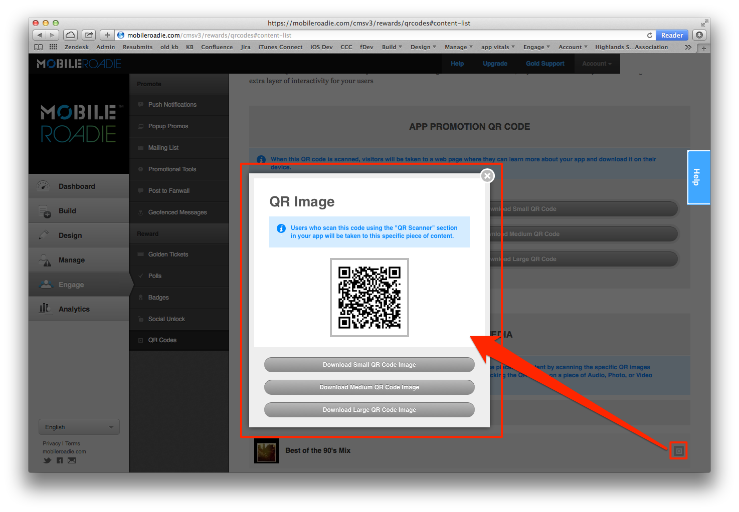 2. Click the Content QR Code to the right of the locked content to bring up a popup box with the QR image and a small, medium, or large version of the QR code which can be downloaded to your computer