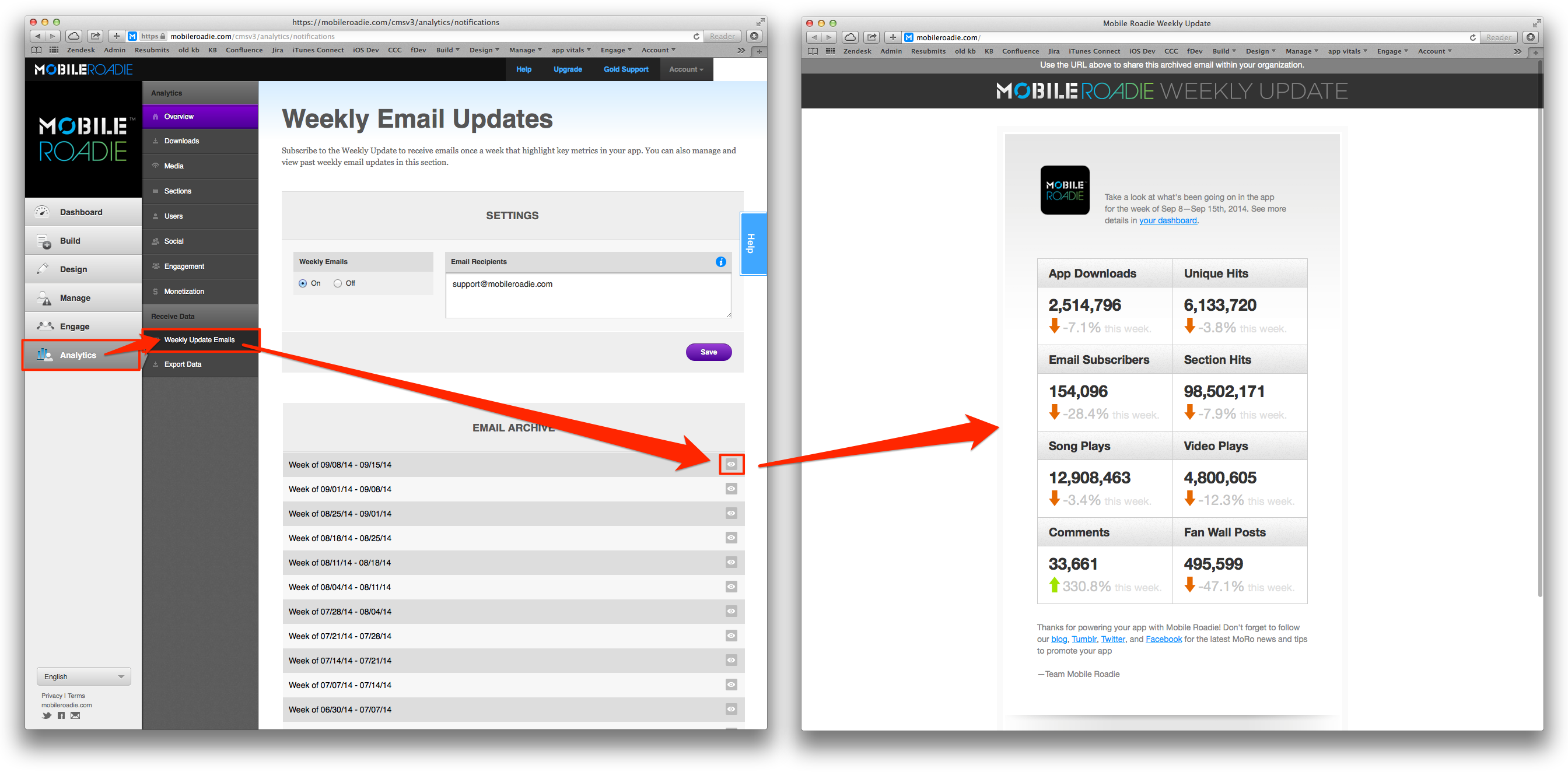 The preview button in the Analytics Menu under Receive Date>Weekly Update Emails allows for the viewing of stats in previous weekly emails. Clicking on the Preview button will redirect to a screen showing the previous Weekly Email Stats