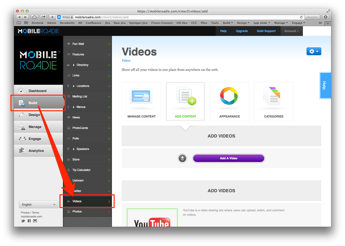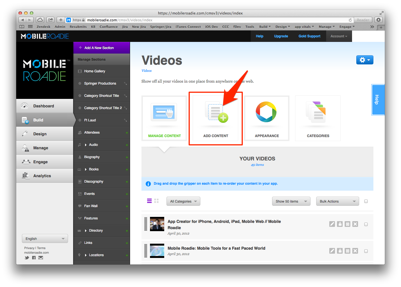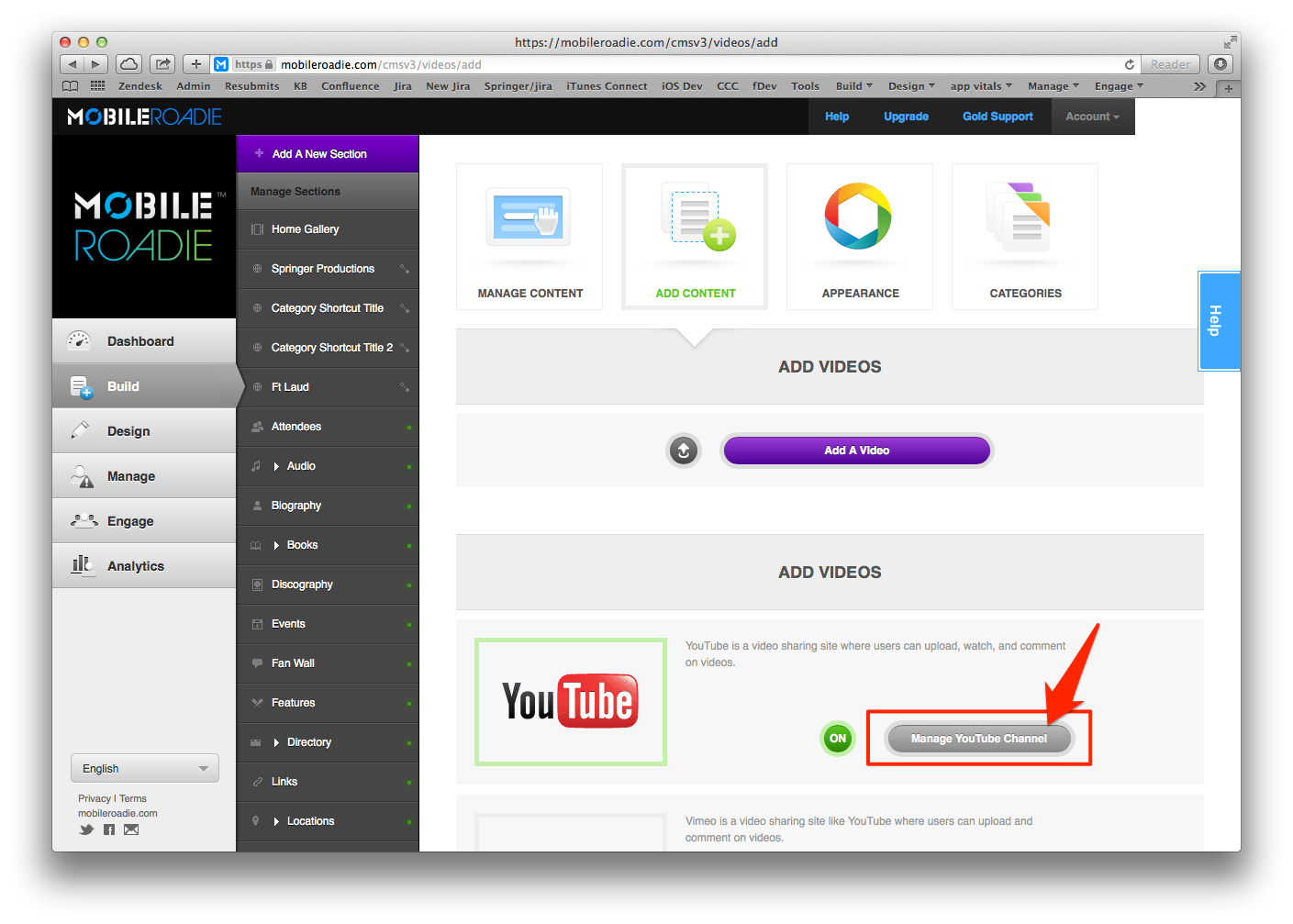 1. Navigate in the CMS to the Build Menu, and click on a section with an integrated third party service with a Refresh button (News section, Photos section, Videos section, etc..)