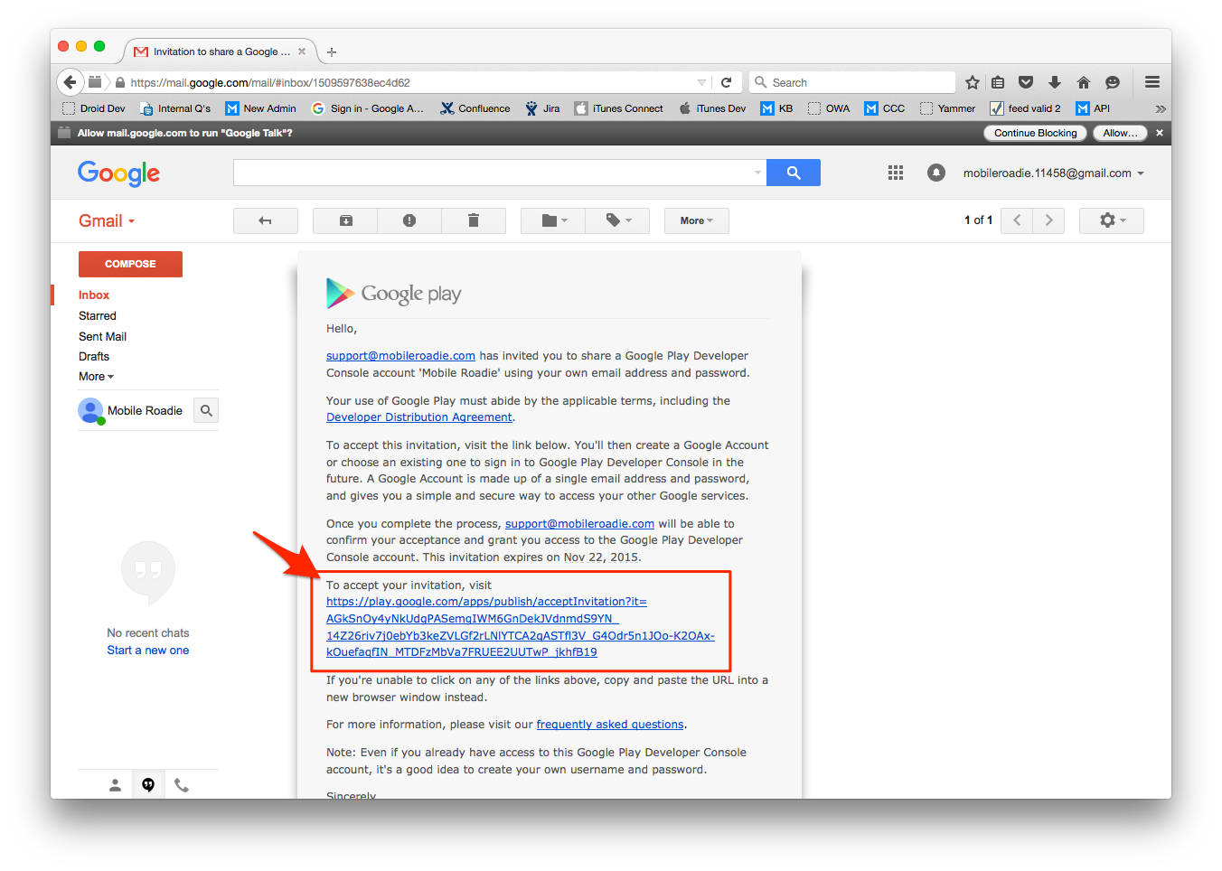 *NOTE* If you were provided with a mobileroadie.xxxxx@gmail.com or manageapps.xxxxx@gmail.com, you would need to contact support@mobileroadie.com to complete this invitation request.