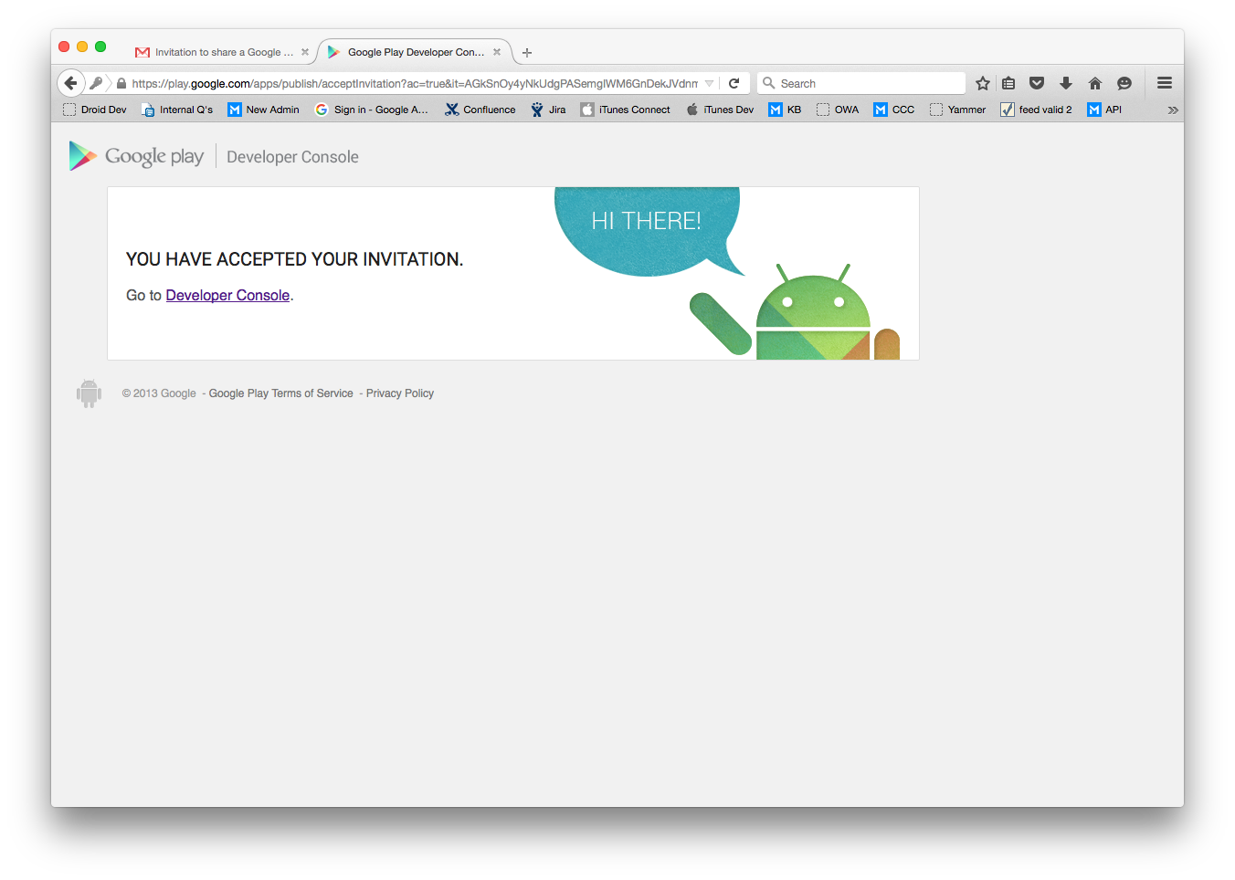 5. You should now see a confirmation that the invitation was accepted. That username/password can now login to https://play.google.com/apps/publish/ and access your Android Developer Account.
