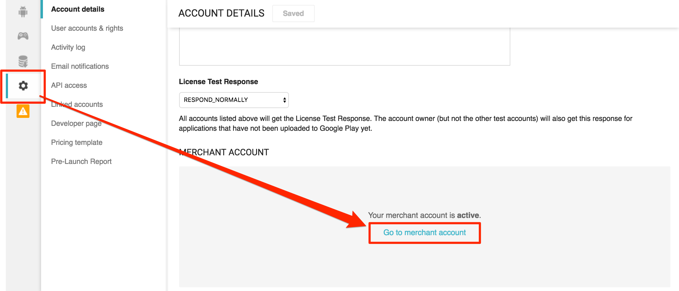 2. Inside the Android Console, select settings, then ‘Go to merchant account'