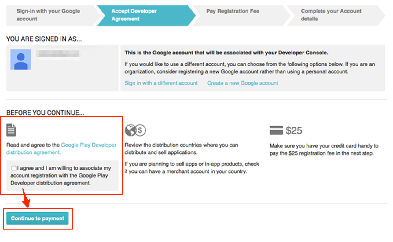3. Select the ‘I Agree’ box for the Google Play Developer distribution agreement