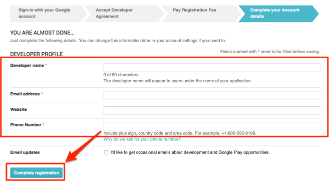 5. Enter the information for your Android Developer Account Profile