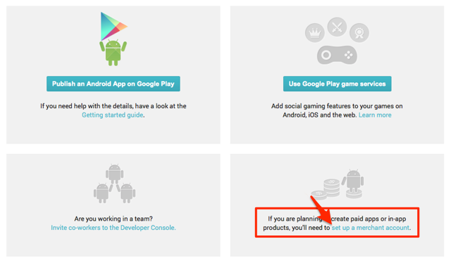 1. From https://play.google.com/apps/publish/, select ‘set up a merchant account’. Fill in the requested information on the following screens to complete your merchant account enrollment.