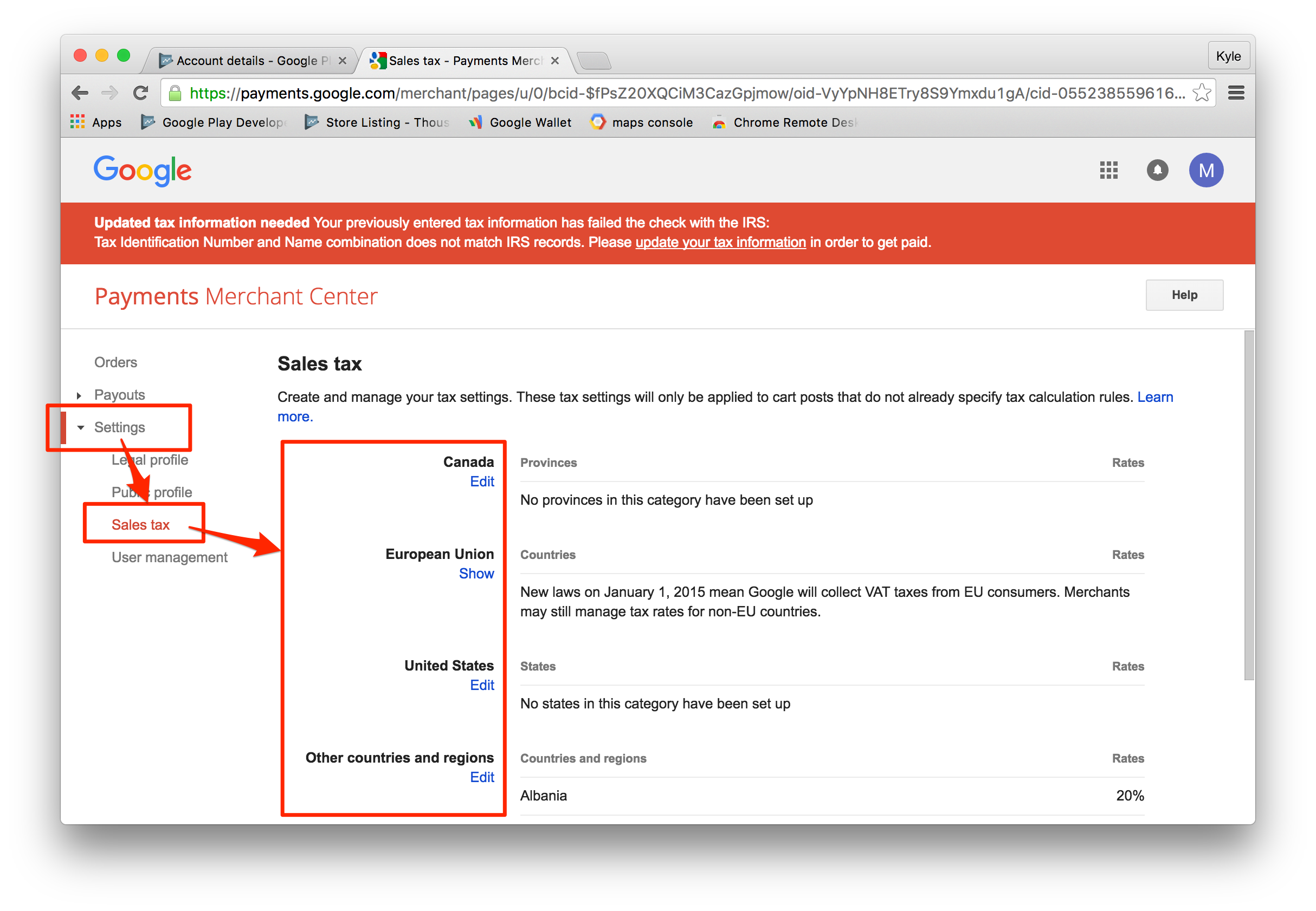 3. Inside the Wallet Merchant Center, select Settings, then Sales Tax. click the ‘edit’ button to fill in the corresponding sales tax information for the regions/locations where you will be providing apps